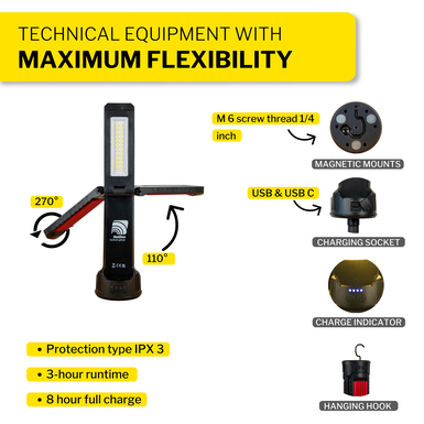 This rechargeable 6000-lumen light system is built for maximum flexibility and convenience. Featuring three adjustable lamps with customizable brightness and warmth levels, it adapts to any environment. The aluminium tripod offers adjustable height, while the built-in hanging hook and magnetic mounts give you multiple setup options. A charge indicator, USB charging lead, and carry case ensure you’re always ready to go.